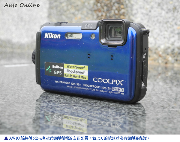 標榜可防水的Nikon Coolpix AW100,在外觀造型上的設計上,當然有其獨到的方式。其仿彿盔甲般的相機機殼,讓AW100符合MIL-STD 810F Method 516.5-Shock的防震標準,可接受1.5公尺的高度掉落地面後仍可正常使用。