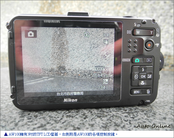 AW100在機頂上有個止滑處理的快門鍵,除此外在機背上按鍵與使用邏輯,大致與Nikon新一代的消費級相機雷同,只需稍加摸索即可將AW100操作自如。雖然AW100有著能在極端天候條件下使用的能力,不過若真在這些天候狀態下,AW100真的可如拍照者的意願操作嗎?