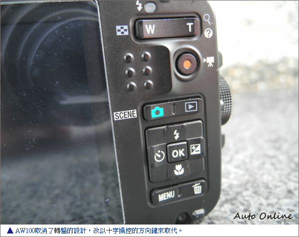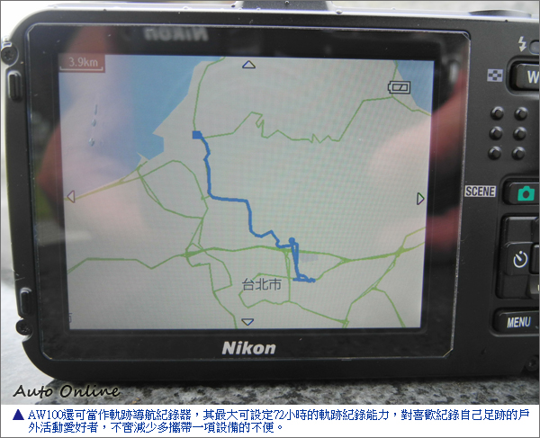 這長條狀的GPS/動作選單按鍵,還有一項功能就是進入GPS的選單。開啟GPS後不僅可以記錄拍照所在地的座標記錄,還可同時在相機內建的地圖上,顯示適才拍照的正確地點之縮圖。另外,AW100的GPS還可當作軌跡導航紀錄器,其最大可設定72小時的軌跡紀錄能力,這對喜歡紀錄自己足跡的戶外活動愛好者,不啻減少多攜帶一項器材的不便。