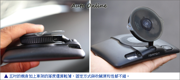 TOMTOM的車架一直都以輕薄短小聞名,而且似乎越新的機種越難感覺它的存在,VIA 125吸盤透過和尚頭與本體接合的設計,要帶走不需拆卸車架而只需把吸盤壓平就能貼在機體背面,平整的設計很好收藏是它的優點,但反而讓螢幕距離使用者更遠則是相對的缺點。