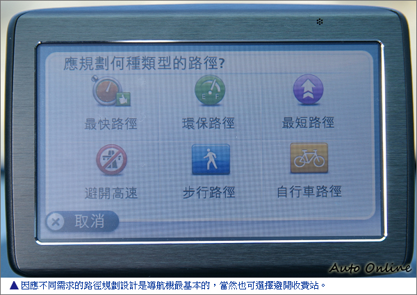 配合可360度固定的車架,因而有了自動翻轉螢幕的設計,不管是習慣固定在前檔玻璃或是吸在中控台的平面上,畫面都永遠是正的,相當方便。至於升級新版操作介面後的VIA 125,圖示與操作邏輯都有了改變,少用的設定功能已經刪除或整合,常用的功能則拉到功能表首頁,甚至為它在導航畫面建立捷徑,不過還是維持在「直覺性」與「大圖示」兩大設計主軸,即使不曾接觸過TOMTOM的人,把玩一陣子也能掌握到要訣,光看照片應該也已經看出七、八成的功能了。