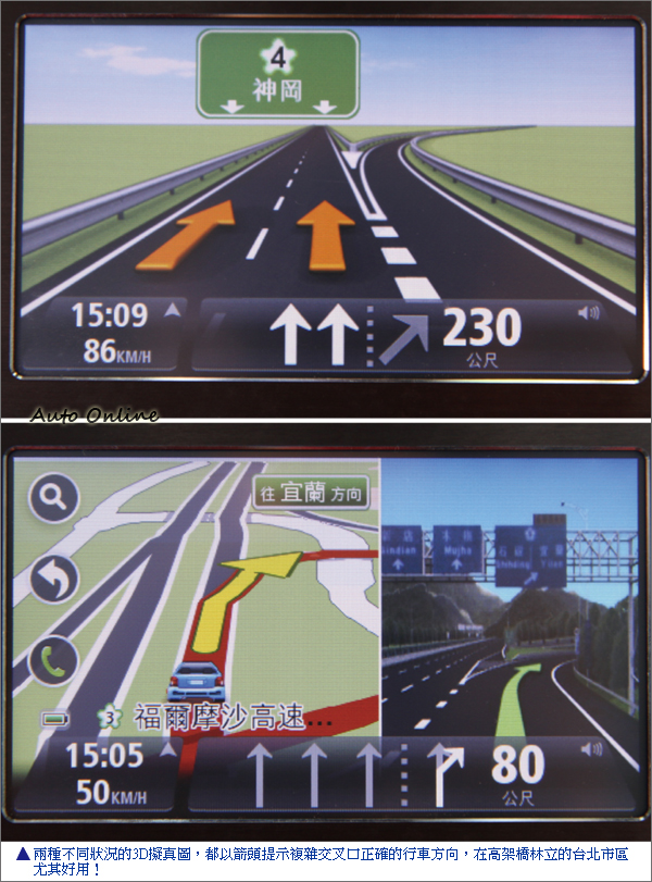 至於導航畫面基本架構改變不大,下方三區狀態列各顯示道路速限/車速/目前時間、車行方向指示、預估抵達時間/剩餘距離,點選後則成為2D/3D顯示、音量控制、路徑摘要等的操作捷徑,其中在路徑摘要中,還額外提供了交通路況、路徑附近的加油站和測速照相機地點,而變更路徑也可以從這裡直接操作。