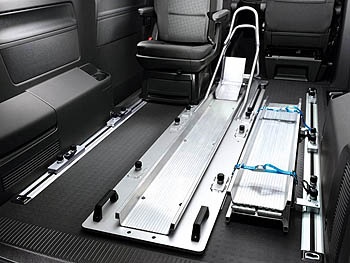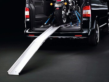 Multivan Easy in Package 配載一套重型機車架,利用Multivan 原內裝滑軌安裝底部軌道,加上兩段式簡易拆卸之活動滑軌,即完成重機運載的準備。整體車軌採18吋鋁合金材質,提供胎寬達190mm、載重達300公斤的規格,滿足所有重型機車的需求。