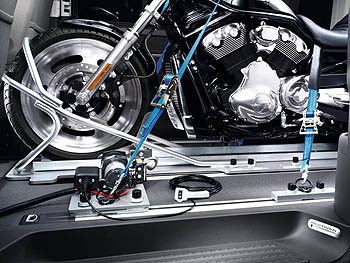 另外附加機車拉索轉盤組,利用Multivan 左前座下之電瓶供馬達運作,以繩索扣緊機車車頭,藉以馬達自動運轉的拉力,讓騎士可以更輕鬆省力的將重機移動至固定位置。前輪定位匣穩定車身,左右兩側共六座束縛器及固定帶,加強重機前、中、後的固定,即使長途運載也可確保重機的安全。