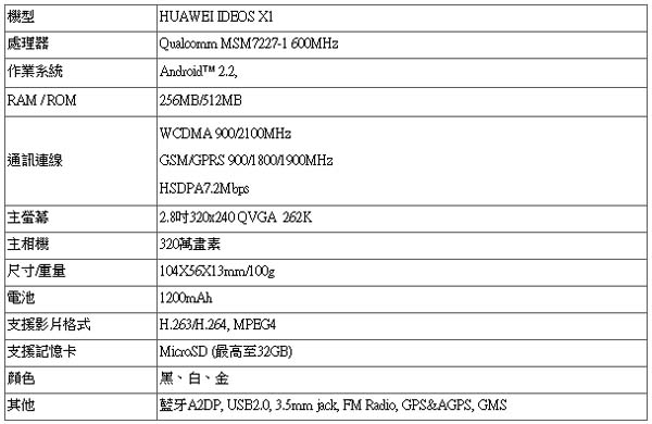 華為與遠傳電信聯手發表小小精靈Google 手機HUAWEI IDEOS X1,鎖定年輕市場喜歡展現自我、經營社群的潮流,以Android 2.2系統、行動AP分享、社群整合、相片、錄影等全方位功能,讓年輕世代無縫升級,實現隨時連網向世界「ㄏㄨㄚˋ聲」的渴望,並且以超低單機價格$4,990元震撼智慧型手機市場。另新申辦/續約/帶門號來遠傳,只要低月付598即可以用0元專案價帶走低單價、高效能的智慧型手機,勢必為智慧型手機帶來另一波的換機潮。此外於2011/9/1~9/30期間購買IDEOS X1及X3,即可獲得迪士尼暑期強檔電影Cars2造型手機套,還有機會抽中香港迪士尼三天兩夜旅遊!至遠傳門市申辦IDEOS X1再享指定配件(配件包, 喇叭, 觸控筆, 皮套, 記憶卡) 9折優惠。