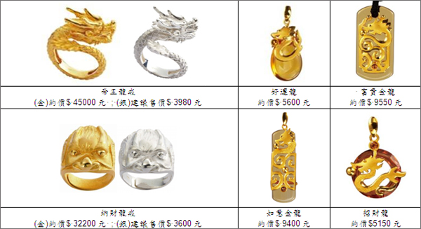 為迎接2012龍年到來,國內知名金飾品牌「長城金飾」特別推出「祥龍開運系列」,助您在壬辰年招財開運、鎮太歲平安祈福,其中更以極具紀念價值的珍藏款「帝王龍戒」最為吸睛!以龍為造型意象,純金鑄造戒身,細緻的雕工透過霧面與拋光交錯呈現出層次躍然的龍頭與盤踞之姿,盡顯奢華高貴。