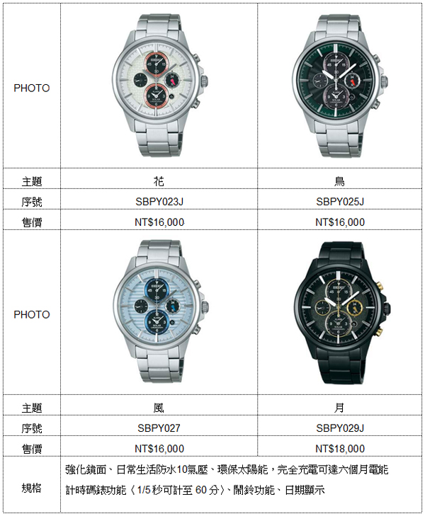 ![]() SEIKO icaré 2 綠色計畫紀念錶,是呼應SEIKO長期贊助於歐洲執行的icaré 2綠色太陽能飛翔計畫所發行的限定錶款,這項計畫企圖實現人類以太陽能長途翱翔於天際的夢想,近幾年icaré 2太陽能滑翔翼持續打破自己的飛行長度紀錄,讓綠色飛翔的理想一步步付諸實踐。SEIKO icaré 2 綠色計畫紀念錶以輕薄明亮為設計理念,打造如天空般的明亮錶盤,左右延伸的線條彷彿起飛時所見的地平線,天空藍的線條則象徵著天際的邊線,帶來輕盈明亮的開拓氣息,台灣限量150只,相當值得珍藏。另一款SEIKO Spirit Smart 130周年碳纖面盤紀念錶,首度結合碳纖材質與太陽能面板,以全黑電鍍不鏽鋼的錶身搭配著碳纖面盤,極簡的低調雅緻美學與高科技質感,打造出都會型男不可或缺的時尚環保經典單品,全台限量300只。此外重量級推出的是SEIKO Spirit Smart 「花、鳥、風、月」特別企劃主題錶款,取材自日本大自然的明媚風光,以不同的配色與意境,分別演繹櫻花綻放、雀鳥飛翔、初夏微風以及皎潔明月等日本古典優雅的景致,展現獨一無二的文化內涵。