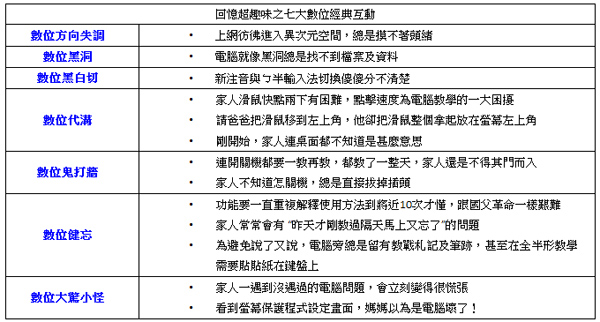 老爸和孩子是家中數位權力大小霸主、老媽成為家中數位灰姑娘!除數位裝置的使用情況外,調查也發現,家中數位裝置的購買主導者為老爸(37.6%),居權力霸主的位子,小朋友僅次於老爸(36.4%)也是家中的數位權力小霸王,而媽媽則淪為「數位灰姑娘」,僅佔16.3%。 七大超趣味數位家庭經典互動大公開!「家庭數位幸福感」調查報告還發現,當家人在教長輩使用數位裝置時,經常出現許多有趣的對話與畫面,可歸納出七大「超趣味」經典互動(註一),像是數位方向失調的「上網彷彿進入異次元空間,總是摸不著頭緒」(30.4%)、數位黑洞的「電腦就像黑洞總是找不到檔案及資料」(19.8%)、以及數位黑白切中常見的「新注音與ㄅ半輸入法切換傻傻分不清楚」(8.0%)等,千奇百怪的疑問讓子女哭笑不得,記憶深刻。此外,還包括「數位代溝」、「數位鬼打牆」、「數位健忘」以及「數位大驚小怪」等狀況,其中最多答題者心有戚戚焉的是,「多數被教學的家人總是同一功能一教再教,桌邊貼滿操作攻略,仍對數位裝置不得其門而入」;此外,像是「桌面傻傻分不清」、「清滑鼠卻真的拿滑鼠去洗」、「關機總是直接拔掉插頭」等難忘爆笑經驗。但縱使家人們的問題無奇不有,對近八成(79.6%)的教學者來說,點點滴滴仍是家庭生活中重要的樂趣與回憶!