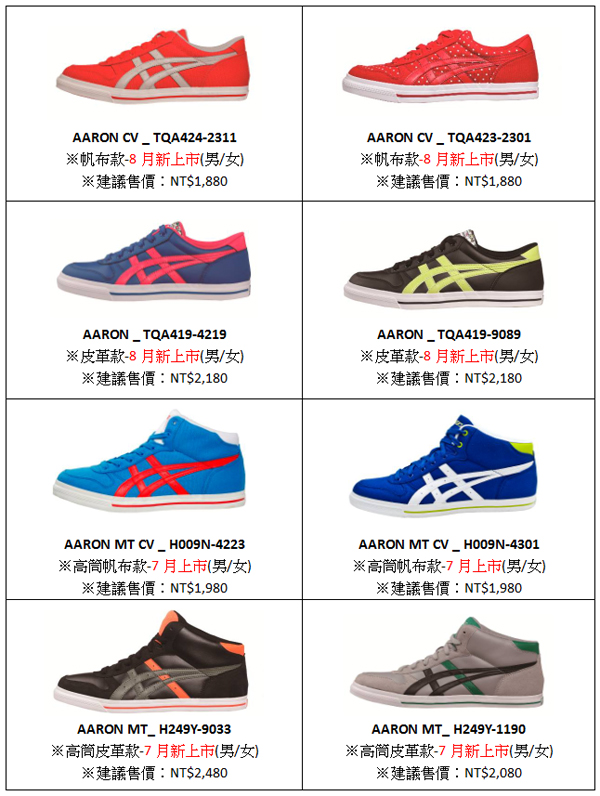 自推出以來便廣受年輕族群歡迎,迎合盛夏大膽跳色的多元配色,既休閒又帶有運動活力的日系風格,更以經典不敗的AARON鞋款最受矚目,可輕鬆自在混搭創造自我特色,強調鮮豔色調的衝突美感,勾勒耀眼的亞瑟士線條,依照心情變換搭配,讓AARON鞋款成為生活中的新亮點。