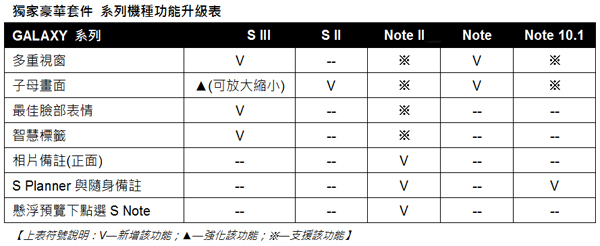 GALAXY 系列產品 全面升級 打造多元行動生活新樂趣![]() ▲GALAXY S II 升級後具備「子母畫面Popup Play」功能讓使用者功能讓使用者在執行其他工作時同時播放影片除了GALAXY S III和GALAXY Note II兩款旗艦產品外,三星此次同步針對GALAXY S II、GALAXY Note與GALAXY Note10.1產品進行功能升級,全系列產品除了同步支援「子母畫面Popup Play」功能外, GALAXY Note 10.1在豪華套件更針對S Planner與隨身備註功能進行升級,讓使用者隨時隨地體驗書寫與記事的創意樂趣、GALAXY Note亦同步升級多重視窗功能,為消費者帶來雙重多工,樂趣更多的新享受。 ![]() ▲GALAXY Noteg升級後則具備有效提升工作或生活效率的「多重視窗 Multi-Window」功能、「子母畫面Popup Play」功能![]() ▲GALAXY Note 10.1在豪華套件更針對S Planner與隨身備註功能進行升級,讓使用者隨時隨地體驗書寫與記事的創意樂趣
