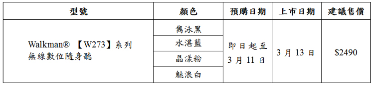 全新的Walkman®【W273】系列無線數位隨身聽即日起至3月11日開放預購,期間凡在全國Sony直營店、概念店*以及Sony官方購物網站購物者,即可獲得限量精美好禮,添加運動樂趣。歡迎消費者前往Sony台北101直營店、概念店*、台北復興直營店、台中直營店、高雄直營店、Sony官方購物網站【http://www.sony.com.tw/store/】、Sony客服中心(電話:4499111)以及各大消費性電子產品通路選購。(* Sony 概念店包含板橋大遠百, 新竹巨城, 台中大遠百, 高雄夢時代)