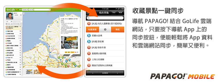 「導航PAPAGO!」除了讓用戶將收藏景點儲存回雲端,更進一步整合GoLife旅遊記錄網站,用戶可以透過網頁管理自己的收藏,並透過GoLife跟朋友分享私房景點;也可以在GoLife瀏覽及收藏其他用戶或PAPAGO!推薦的熱門景點,並直接將這些遊玩的資訊同步到App,立刻導航,再也不用為了找私房或新興景點,陷入迷途;「導航PAPAGO!」也會利用地圖及語音提示您附近的收藏地點,為您的旅途帶來意外的驚喜。