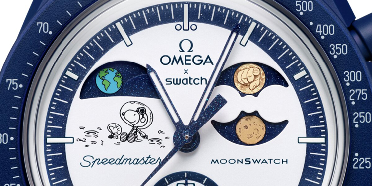 ![]() 這款全新腕錶視覺設計延續系列精髓,採用相同的星空錶盤,搭載Swatch最新的地相創新技術,月相顯示飾以OMEGA Moonshine™ Gold,並搭配 Snoopy 世界插圖。正如 Bioceramic MoonSwatch 系列的所有款式一樣,這款 MISSION TO EARTHPHASE – MOONSHINE GOLD採用了 Swatch 的專利材質 Bioceramic 生物陶瓷打造而成,這種混合材質包括陶瓷成分和萃取自蓖麻油的生物源材質,呈現獨特海軍藍色調。
