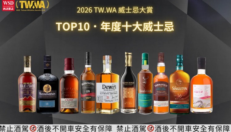 本屆參賽酒款逾100款,範圍橫跨五大產區 蘇格蘭、愛爾蘭、美國、日本,以及全球產區(含台灣、瑞典、澳洲、英格蘭等地)。依工藝分為單一麥芽、調和、泥煤、原酒、穀物、裸麥等6大類、35個分項。 評選過程嚴格遵循國際烈酒競賽的「百分制」規範,並透過科學化數據過濾極端分值。「好酒不應被名氣掩蓋」是TW.WA始終傳遞的核心價值。透過全盲飲機制,許多實力雄厚的新興品牌或隱藏酒款在本次大賞中脫穎而出,打破了品牌的既定印象,為台灣威士忌市場注入多元生機。 本屆【年度十大威士忌 TOP 10】得獎名單與評鑑重點