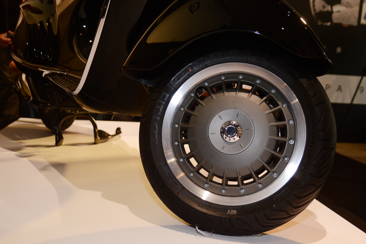 全鋁製的前擋泥板為12吋的前輪提供了典美雅致的遮蓋。後輪亦為12吋。兩側車身大型後導流孔的設計,源自第一輛Vespa車型上所安裝的鼓式煞車盤之設計理念,是有史以來Vespa車款上所搭配的最大型導流孔,並進一步提升了Vespa 946外觀線條的流暢與運動風格。