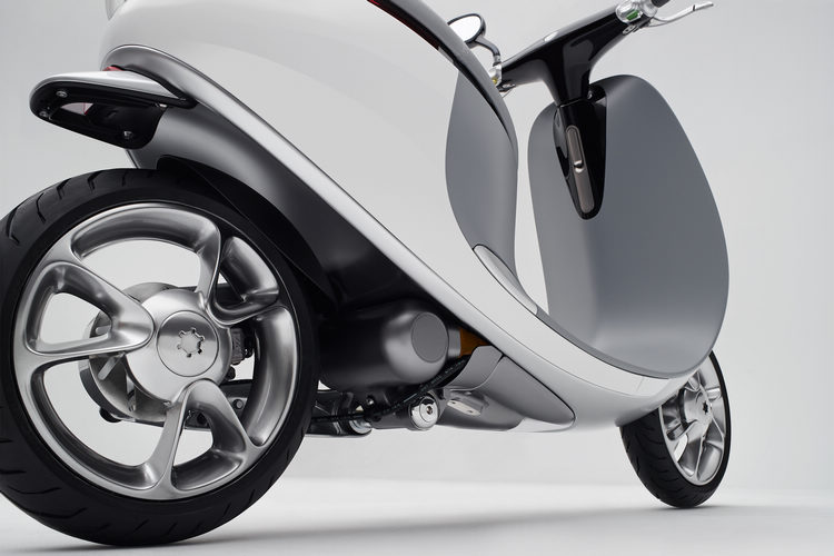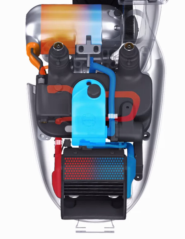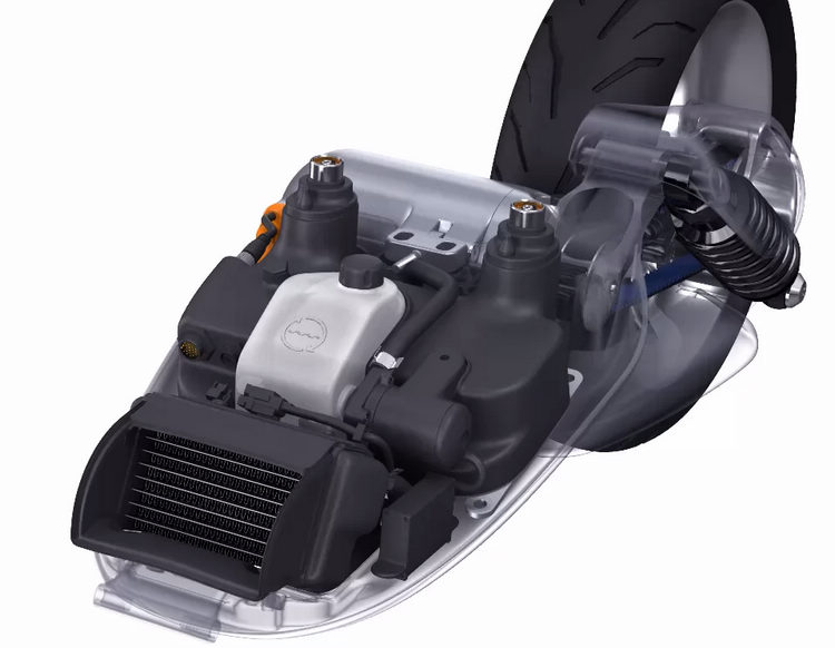 SmartScooter尺碼為1,730 mm x 690 mm x 1,215 mm,軸距1,230 mm,外型充滿了設計感,全車外殼不使用任何螺絲固定,且原廠聲稱透過軟體分析其空氣動力,至於速克達的基本架構對於台灣人來說並不陌生。 ![]() ▲動力模組使用水冷以及特殊設計的通道提高散熱效率。