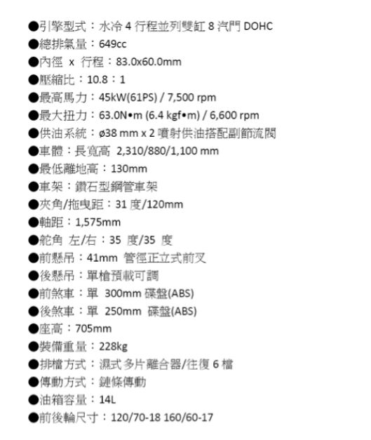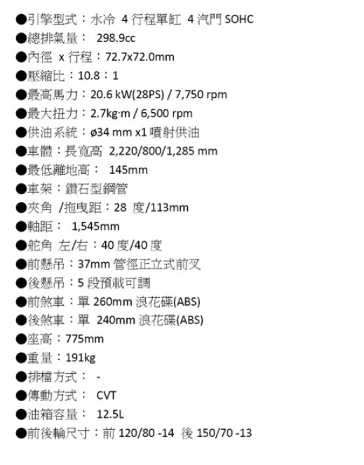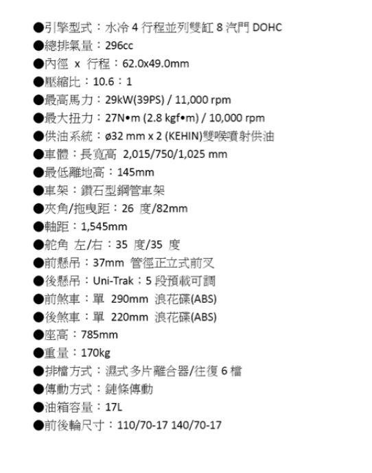 身為Z家族成員,加上後避震採用高規格的連桿式結構,操控的優異性自不在話下,但令人稱道的是車身上所配置的安全機制,除了ABS煞車系統,更有媲美競技型超跑搭載的滑動式離合器,不僅減少輪胎在檔煞時可能導致的鎖住現象,新穎的機件設計更可以大幅減輕左手拉動離合器的力道,讓騎士長途騎乘不易感到疲勞。 擁有出眾外型與超越同級車的配備規格,Z300在親和力、經濟性、運動樂趣與安全性取得高度平衡!