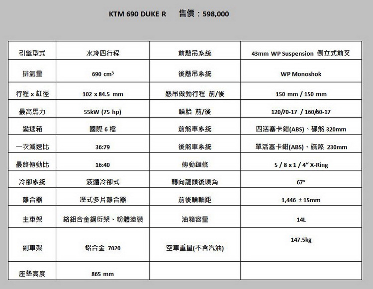 2016年KTM台灣總代理安東貿易,推出KTM 690 DUKE R全新改款車款,為2016帶來不同嶄新風貌,再度展現KTM具有優越操控性能的街車690 DUKE R,表現出KTM強而有力的優越馬力與頂級配備,更將最新科技結合車款,將安全性能大幅提升,讓騎士們在騎乘中,享受快速與舒適安全的騎乘感。