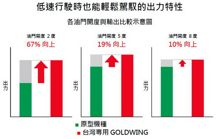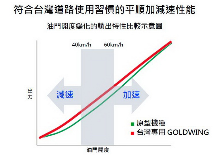 音響控制介面考慮到長途出遊時,都會有較大的行李空間需求,GOLDWING提供了收納容積達61公升的後行李箱與合計容量共81公升的左右側箱。電動式倒車系統讓騎士即使是在狹窄的空間進行停車或迴轉,都能感到安心與便利。此外,為了對應台灣的用車環境,GOLDWING也有做台灣規格的專屬調整,具體的調整項目一為針對低速狀態下提高不同油門開度下的扭力輸出,讓車子在低速下的駕馭更輕鬆。另外則是讓加減速的動力輸出特性調得更為平順來符合台灣的道路使用習慣。