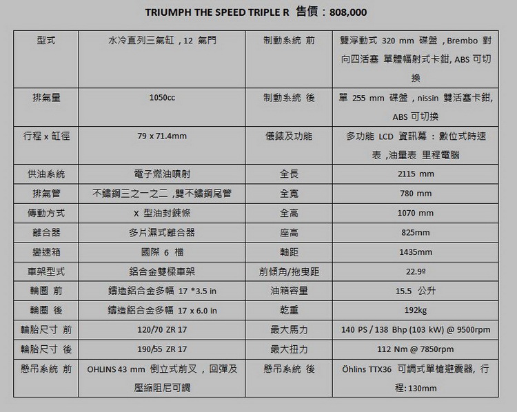 TRIUMPH運動街車代表SPEED TRIPLE車型自1994年推出以來,以卓越的運動性能擄獲不少人心,曾因在《不可能的任務》中為湯姆克魯斯騎乘的車款進而聲名大噪。總代理安東貿易2016年底推出全新改款的TRIUMPH SPEED TRIPLE R,將車款的各項性能重新調校及外形設計上更加銳利同時兼具速度感,相信將帶來英式運動街車的風潮。