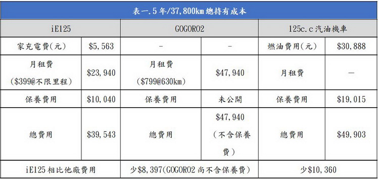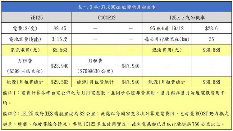 大電池終身保固 iE125每月費用分為月租與家充電費,每月不限里程基本費率為399元,家充電費參照台電公佈之每月用電度數,分別對應夏月與非夏月電費之平均值;汽油車輛則以經驗值每公升行駛35km,對應2019年12月4日95無鉛每公升28.5元計算,GOGORO在每月可行駛630公里,799元月租方案最為合適,但須注意的是若超過630公里,則需以每公里1.5元額增使用成本。 iE125五年下來能源與月租費用只要29,503元,在能源與月租成本上取得領先。GOGORO 2在不超過基本里程的前提下,總費用仍高達47,940元。如果是125c.c.汽油速克達,雖然沒有充換電的問題,但必須在一段時間就要到加油站報到,以目前95無鉛汽油每公升28.6元,每公升35公里計算,五年油錢也需要30,888元,所以就能源費用五年的支出iE125小幅勝出汽油機車,但兩者均以大幅差距領先GOGORO2。