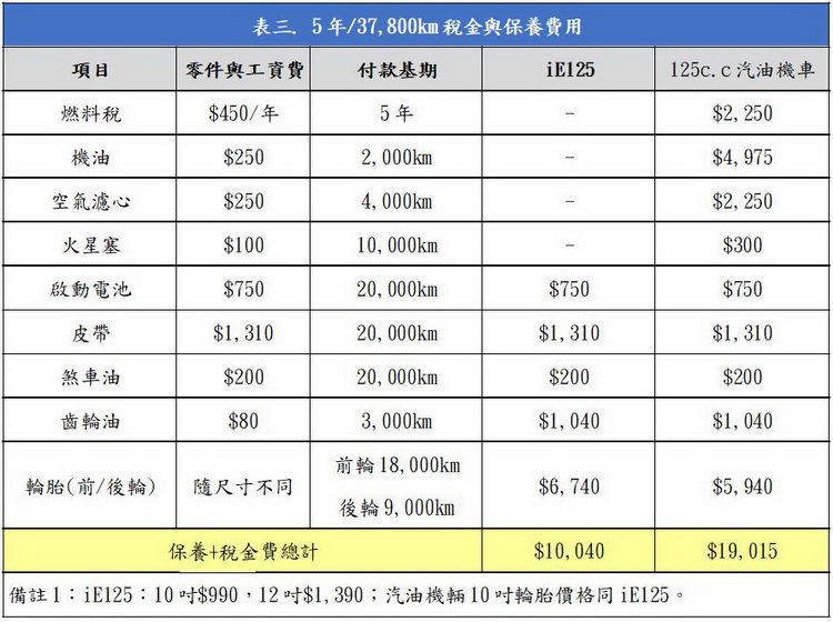 定保品項很單純 養車除了必須支付能源費用外,定期的保養維修才能行得更遠,而這些費用可一點都不能省。同樣以五年37,800km計算,iE125總費用為10,040元,125c.c.汽油速克達為19,015元,兩者的費用差距將近2倍,差異的主因在於iE125少了燃料稅、機油、空濾等油車引擎必要保養費用(表三)。GOGORO 2因原廠未公佈保養費用,故在此不進行比較。