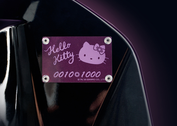 PGO電動車將歐洲經典及貴族御用色加以運用,並開創全新「迷幻紫」色調,點綴上各式樣珠寶元素,搭配身前珠寶項鍊,昇華成今年度最引人注目最絢爛的絕美騎機;車色除了紫色外,這次聯名款也推出了另一款「搖滾白」,搭配珍珠質感呈現另一種高貴、典雅的風格,凸顯嫻雅端莊格調,溫柔鉅獻;而在車側也設計了大面積的Hello Kitty主題彩貼,更加完整的呈現聯名車型的主題性。
