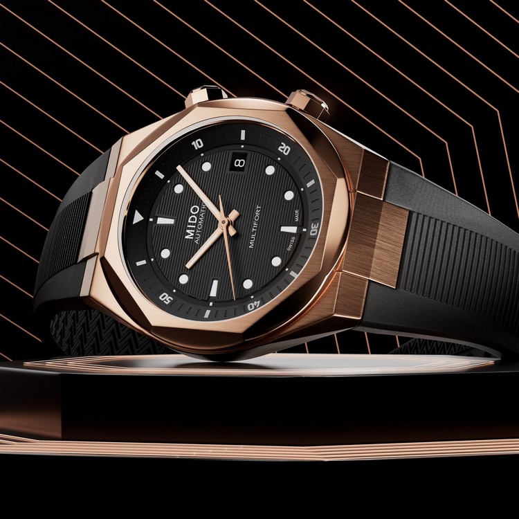 腕錶搭載 Caliber 80 自動上鍊機芯,配備 Nivachron™ 抗磁游絲,確保走時穩定精準,並提供長達 80 小時的動力儲存,讓腕錶即使在年終假期短暫放置後,仍能隨時回到運轉狀態。透明底蓋可欣賞機芯運轉細節,展現瑞士製錶工藝的細膩處理,100 米防水性能則進一步提升日常佩戴的安心感。這款金色 TV 腕錶在年終節慶中,不只耀眼,更成為不可錯過的焦點之作。建議零售價 NT$46,300。 Multifort 8 Two Crowns 玫瑰金光 年終犒賞的沉穩之選 相較於 TV 系列的高調輪廓,Multifort 8 Two Crowns 以結構感鮮明的設計語言,呈現另一種同樣吸睛的金色風格。玫瑰金色 PVD 鍍層為錶殼帶來溫潤而深邃的金屬光澤,搭配標誌性的八角形錶圈與俐落切面線條,使整體外型更顯立體有力,在節慶場合中展現沉穩卻不容忽視的存在感。腕錶最大特色在於雙錶冠設計,位於 2 點鐘位置的錶冠用以操作內部旋轉錶圈,4 點鐘位置的錶冠則負責時間與日期調校,清楚區分功能操作,使佩戴與使用更為直覺。錶盤配置立體時標與指針,並覆以 Super-LumiNova® 夜光塗層,在不同光線條件下皆能維持良好可讀性,兼顧造型層次與實用需求。