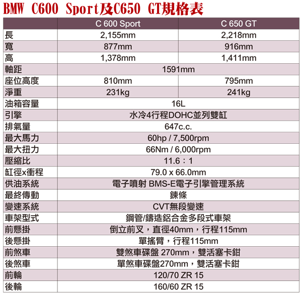 一開始先別被600與 650數字給騙了,跟BMW的汽車一樣,C 600與C 650在這裡不全然指的是排氣量,兩款車其實所用的都是同一顆並列雙缸氣冷引擎,排氣量647c.c,最大馬力60匹/7,500轉,扭力峰值則為66Nm/6,000轉。