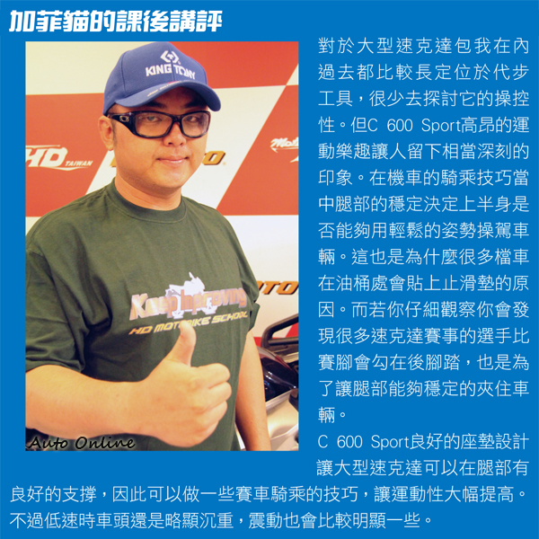 不過C 600 Sport就給人相當強烈的運動氛圍。不過平實而論這樣的驚喜並非來自它的動力,而是源自它良好的騎乘姿勢與扎實的車體底盤設定。值得大大讚賞的一點是車輛給予騎士相當不錯的騎乘三角點,雖然坐墊高度讓個頭矮小的騎士在駐車時有些吃力,但當速度起來後會明顯的發現車輛靈活的動態反應與穩定的路感。
