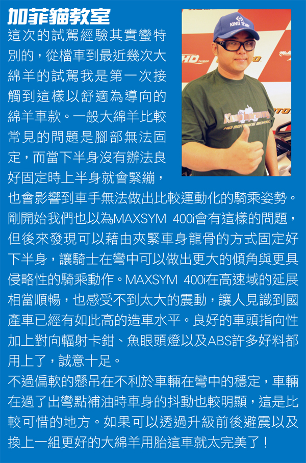 我很喜歡港媒對MAXSYM 400i下的結論,他們說雖然MAXSYM 400i比起日系大廠的車架或是引擎技術還有一段距離,但實惠的售價與夠水準的表現讓人也找不到苛求它的理由。此言著實中肯,很多人常犯的毛病就是用不同售價不同定位不同取向的基準去比較兩台車款,MAXSYM 400i也許不是完美的車款,但這售價對照配備與各項表現C/P值也夠高了!