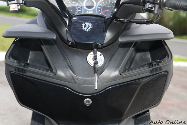 MAXSYM 400i身上也看得出許多來自汽車界的設計。比方說儀錶板的造型跟許多國產汽車的儀表幾乎一樣,中間還有一個液晶顯影的行車資訊顯示螢幕。此外車上不但有12V的車充插座現在還附上USB插槽,帶上電源線就可以替手機或是導航充電,對於一台以旅行車定位的車款來說這樣的設計實在是既方便又好用。