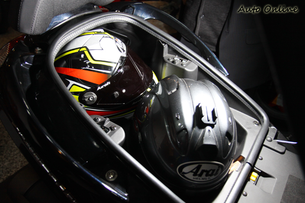 ▲原廠標榜可以放下兩頂全罩式安全帽,經過實驗證明擺入一頂歐系大帽體安全帽與一頂日系女用全罩帽沒問題。但有些帽子得避開貓耳的設計才能順利關閉。
