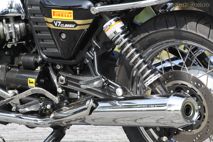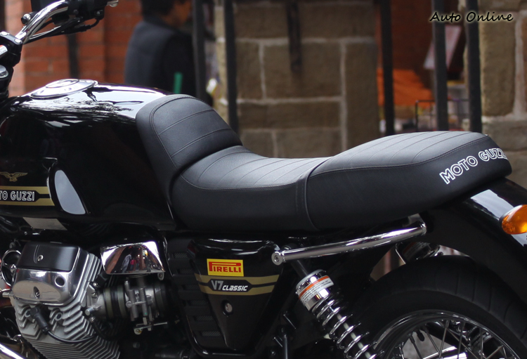 除了車輛外觀適合這樣悠閒的氣氛外,車上許多設計其實也可以看得出來車廠對於這台車型的定位。比方說Guzzi V7用軸傳動取代鍊條傳動,好處在於這樣的設計動力反應直接順暢,保養相對容易運作時也比鍊條傳動安靜,缺點就是太重。