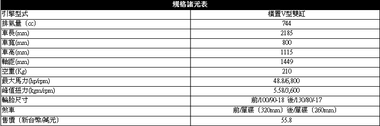 採用橫置V型雙缸有兩個好處一是這樣的設計可以避免過去縱置雙缸後缸散熱不良溫度較高的毛病,再者由於橫置V2缸車身輛可以在彎中獲得比較好的動態,車手不大需要靠側掛的方式即可順暢過彎,對於輪胎的消耗也會比較節省一些。