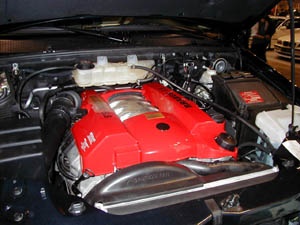 ![]() ▲極具侵略性的紅色汽缸上製lash;,搭載在這輛M-Class上的5.8升V-8能讓笨重的車身在6秒不到的時間內加速到100km/h。至於在展出的BRABUS ML5.8上所搭載的動力系統,則是以原本4.3升的V型八缸引擎作為基礎,經過擴大缸徑與衝程到99×93mm的程度,使排氣量提昇到5727cc.。經過調校後這具引擎的動力從原本就已不小的306hp提昇到400hp/5750rpm的驚人水準,最大扭力則為59.0kgm/3000-4250rpm。雖然是輛體積龐大的SUV,但ML5.8卻能在5.9秒內加速到100km/h,並達到286km/h的極速。目前詮國所引進的BRABUS套件在引擎系統的改裝上,採用的是從德國將整具改裝完成的引擎原裝進口,然後在國內施工將引擎裝入車內的作法,因此不必擔心改裝過程中的施工品質會有任何不完善之處。不過,為了避免施工上的困難,廠商是建議車主在考慮改裝引擎的版本上盡可能選擇與原廠系統一樣的版本,例如原本搭載六缸引擎的280或320車型改裝六缸的3.8系統,而八缸的430或500車型則可選擇5.8升的V-8。