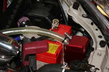 ▲小電瓶是增加引擎室空間的好辦法,但是要隨時注意效能問題,以免發不動,電瓶前後方為曲軸箱廢氣回收瓶。 |