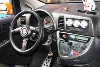 ▲內裝改裝以方向排和排檔桿、金屬踏板為主,儀錶部分乃挪用音響主機位置,主因是為了高辨識性及整體性考量,反正原廠主機品質也不是很優。 |