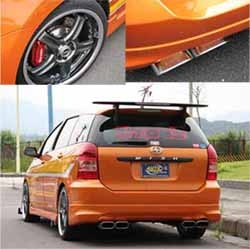 還記得AOL雜誌5月號的Wish改裝報導嗎?基本上這兩部車都出自同一人之手,動力改裝大同小異,外觀也是直接流用日本TOYOTA原廠套件,只有細節上的差異,前者偏「隱性」基因且有裝可愛的趨勢,車色還是白底未改,車尾天線飾品還用「布娃娃」沖淡殺氣。後者乃絕對武士取向,車尾掛個×彈拿著槍和盾牌,明確表達嗜血特性!