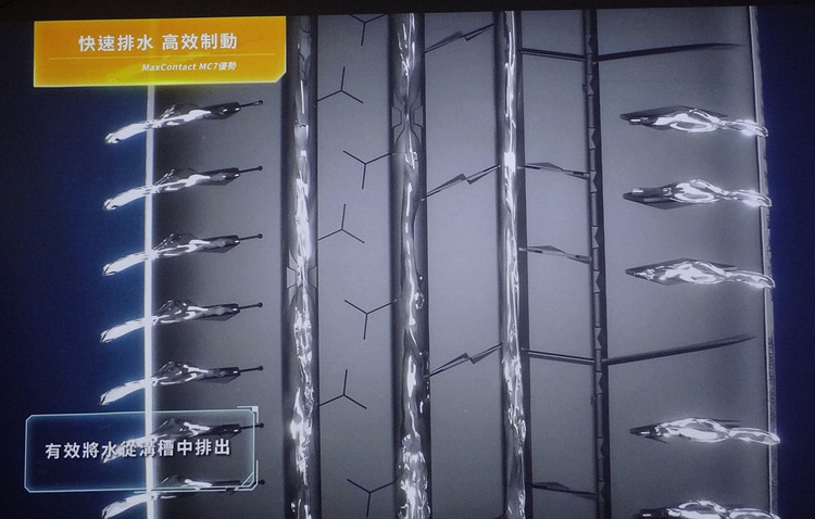 MC7並以3D精準切割的排水花紋,於兩側外緣胎溝採用更深、更寬的紋路,讓輪胎在過彎時能將積水暫時鎖在花紋中,使胎塊持續接觸地面提供抓地力;內側胎肋則採用星形和閃電紋路,連通中央排水溝槽,迅速將積水排向主溝槽;而在主溝槽則有特殊Flow X-celerator流量加速器,加速水流通過,以避免輪胎和路面之間形成水膜現象。