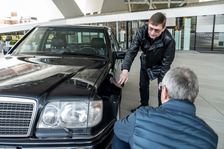 ![]() ▲Hölscher和Mönig細細端詳獨特的外觀空力套件,對於車體製造部門同事的能力及卓越遠見感到無盡欽佩。1988年,保時捷從Daimler-Benz AG獲得這項專案的開發合約,雙方在下圖爾凱姆 (Un-tertürkheim) 簽約。確切的專案要求為「為W124基本款帶來開創性的設計」,且要使用500SL的5.0升V8四氣門引擎。截至1995年4月,開發團隊製造出了10,479種樣本 ── 全都是四人座(因為後軸差速器龐大的體積,佔去後座中央的底部的空間)。 ![]() ▲為了慶祝500E成為經典之作和紀念誕生30週年,保時捷博物館邀請到兩位參與開發的重要人物,來介紹這輛車的精彩故事。