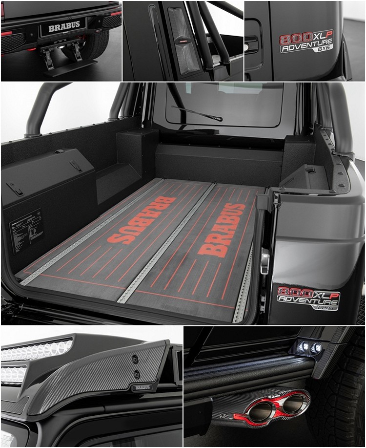 德國改裝名廠 BRABUS 推出全新 XLP 800 6x6 ADVENTURE,基於W465的Mercedes-AMG G 63 打造,將經典五門 G-Class 徹底轉化為六輪越野皮卡。為容納第三軸,鋼製梯形車架延長 153 公分,並加裝極高抗扭剛性的鋼製模組,以承受極端越野時的扭力負荷。