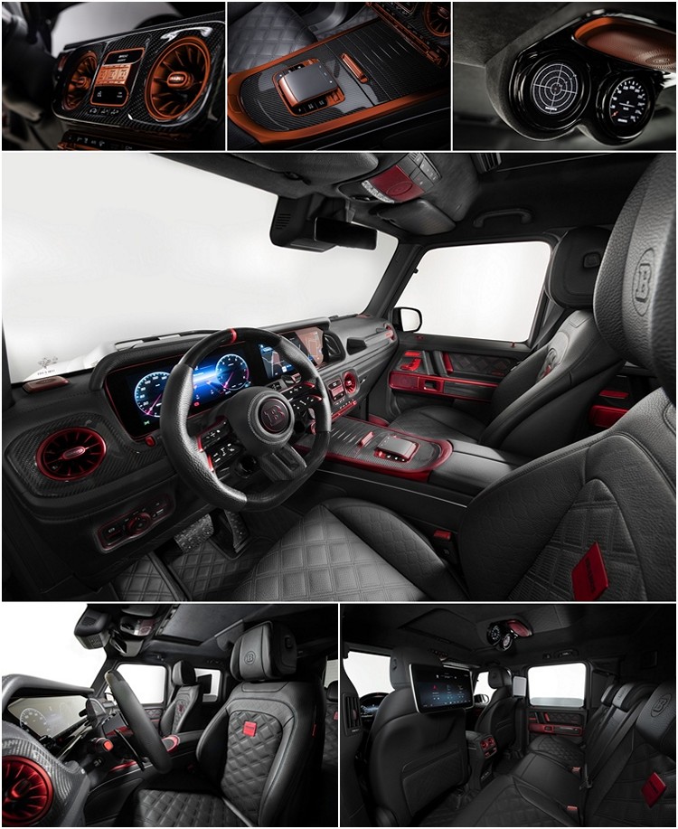 內裝以頂級黑色皮革包覆全車,座椅表面施以 BRABUS “Dual Cube” 菱格縫線與精準打孔,質感細膩。超過 200 處內裝細節以專屬 “ROCKET RED” 配色點綴,涵蓋按鍵、出風口、飾板、把手及門鎖栓,營造濃厚運動氛圍。