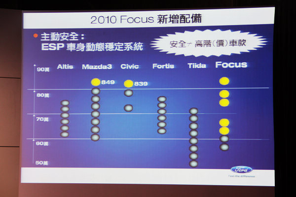 ![]() ▲業者強調Focus價格為同級競爭對手安全配備領先者。福特六和會中也宣布2010年的四大產品主張「Drive Quality」、「Drive Green」、「Drive Safe」、「Drive Smart」,總裁李國寶表示,這次針對台灣消費者日漸重視的主被動行車安全防護項目上所提出的ESP車身動態穩定系統及4氣囊加碼進化,更是將『Drive Safe』的精神發揮得淋漓盡致!這正是代表福特品牌對台灣消費者的重視與承諾,未來福特也將持續秉持這四大產品力,永續經營台灣市場,引進並打造具競爭力的新商品,讓消費者真切感受福特品牌的進化蛻變與廣獲全球市場肯定的嶄新實力。