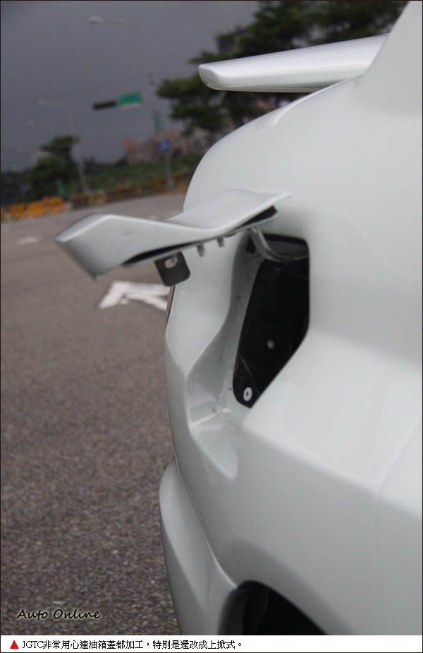 前後葉子板爆龜的寬度比原本的大上一倍,達到Mike夢想中WRC寬體式樣,不過如果沒有對Impreza有深入了解的玩家第一眼還真的看不出哪裡有差別,只有行家才有辦法第一眼分辨出差異。JGTC另外一項巧思在油箱蓋上面,一般的改裝店家不會連油箱蓋都一起加工,但JGTC不但把油箱蓋加厚還改成上掀式,看的出JGTC對客戶的用心。