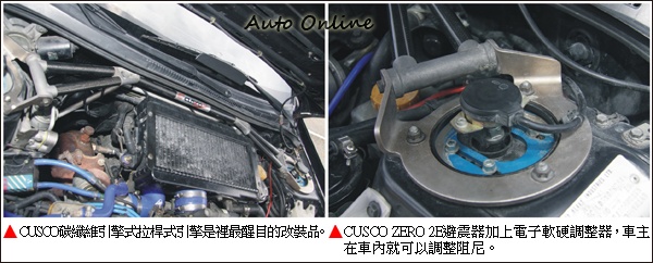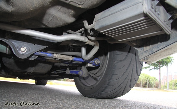 車子剛買來原本的避震器就多隻漏油,車主尋覓一段時間買進中古CUSCO ZERO 2E避震器加上電子軟硬調整器,開起來軟硬適中,不會有多餘的彈跳,最大的特點是在車內就可以調整避震器的阻尼,不需要開啟引擎蓋來調整。底盤除了避震器加強外,STI後六連桿也是值得投資的東西,它讓路感更清晰、直接,但在選擇上需要注意,品質不好的魚眼六連桿沒開多久就會出現異音,這小小的異音可是會讓車主抓狂。