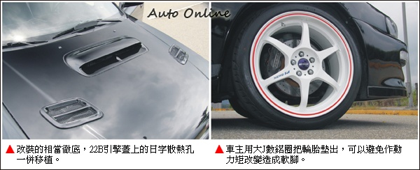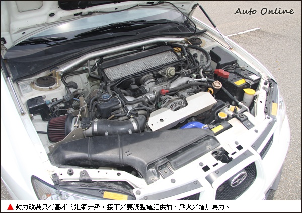 外觀大致上已經達到車主馬尼的期望,一些22B細小的地方,例如引擎蓋日字網、水箱護罩紅色SUBARU標誌都換上22B式樣。至於輪距的增加車主沒有選擇加寬墊片,而是選擇J數較大的鋁圈來達到輪距加寬,使用墊片加寬會有一個壞處,因為加墊片之後避震器力矩的關係,在原本避震器沒有變動的情況下會感覺阻尼變軟,但如果用鋁圈J數來改變輪距就不會有此現象。