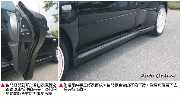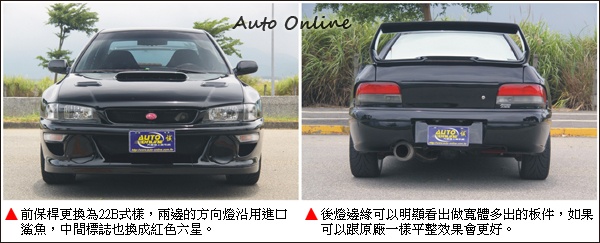 GC8前面要達到寬體的效果很簡單,葉子板套件買來就可以直接上,前保桿也更換為22B式樣,角燈可以選擇進口Impreza角燈直上。最困難的部分在於後葉子板的板件修改,必須要原板件外面焊上一塊板件,其它部分用補土去修飾,但最重要的精隨在它的耐用度,GC8不像22B一樣是兩門車款,所以後板件勢必要跟後門做結合,如果你後門打算封死不載人那對店家反而輕鬆,如果要保留後座的功用,不僅把手要外移,板件的抗震性就要有一定水準,不然後門開開、關關板件跟板件之間很容易產生裂痕。
