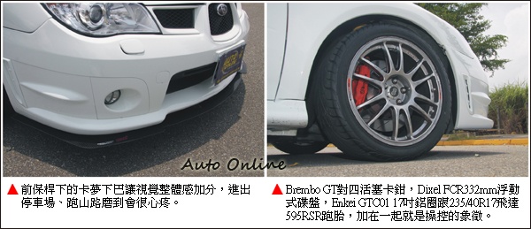 從前驅的DC2轉戰四驅的Impreza開山路的方式全然不同,進灣速度要比前驅車來的慢未到Apex提前補油出彎是標準的四驅開法,入彎前的急煞考驗到煞車的好壞;換掉原廠對象四活塞卡鉗改為Brembo GT對四活塞卡鉗,Dixel FCR332mm浮動式碟盤,在入彎前的急煞帶來很大的幫助。