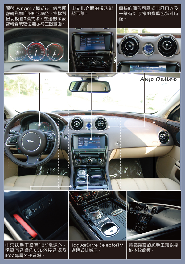 JAGUAR XJ 3.0 TDV6無論是在市區的行車,或是高速道路上的巡航、超車,都能憑藉低轉速大扭力的優勢,不急不喘的在市區走走停停,就算面對高速道路超車,也只需油門輕點即可以在安全的速度、距離下完成超車動作。若真遇有緊急狀況需要全油門加速的話,XJ 3.0 TDV6也是可爆發出驚人的加速力道的。 結語 一趟路實地試駕下來,JAGUAR XJ 3.0 TDV6的行車表現確實符合運動級的身手,XJ 3.0 TDV的車艙質感,也讓車室乘員乘坐起來,能感受到那份手工完成的尊貴禮遇。雖然470萬的定價高於其競評對手許多,不過在行車性能勝出且還多了份對手無法攀擬的貴族氣息下,多花些錢買輛較不易撞衫的豪華房車還是比較值得的。